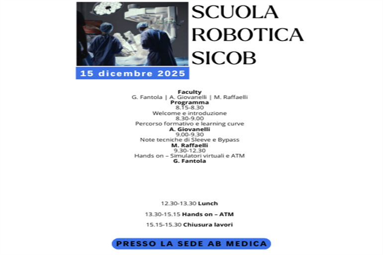 La SICOB – Società Italiana di Chirurgia dell’Obesità e delle Malattie Metaboliche indice il presente bando per la selezione dei partecipanti al Corso di Robotica SICOB 2025, come da programma ufficiale (Hands-on su simulatori virtuali e ATM, lezioni tecniche e percorso formativo) illustrato nel documento allegato.